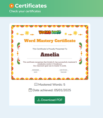 Once a student has mastered the number of words set by their teacher’s Mastered Words Goal, they will automatically earn a Word Mastery Certificate.