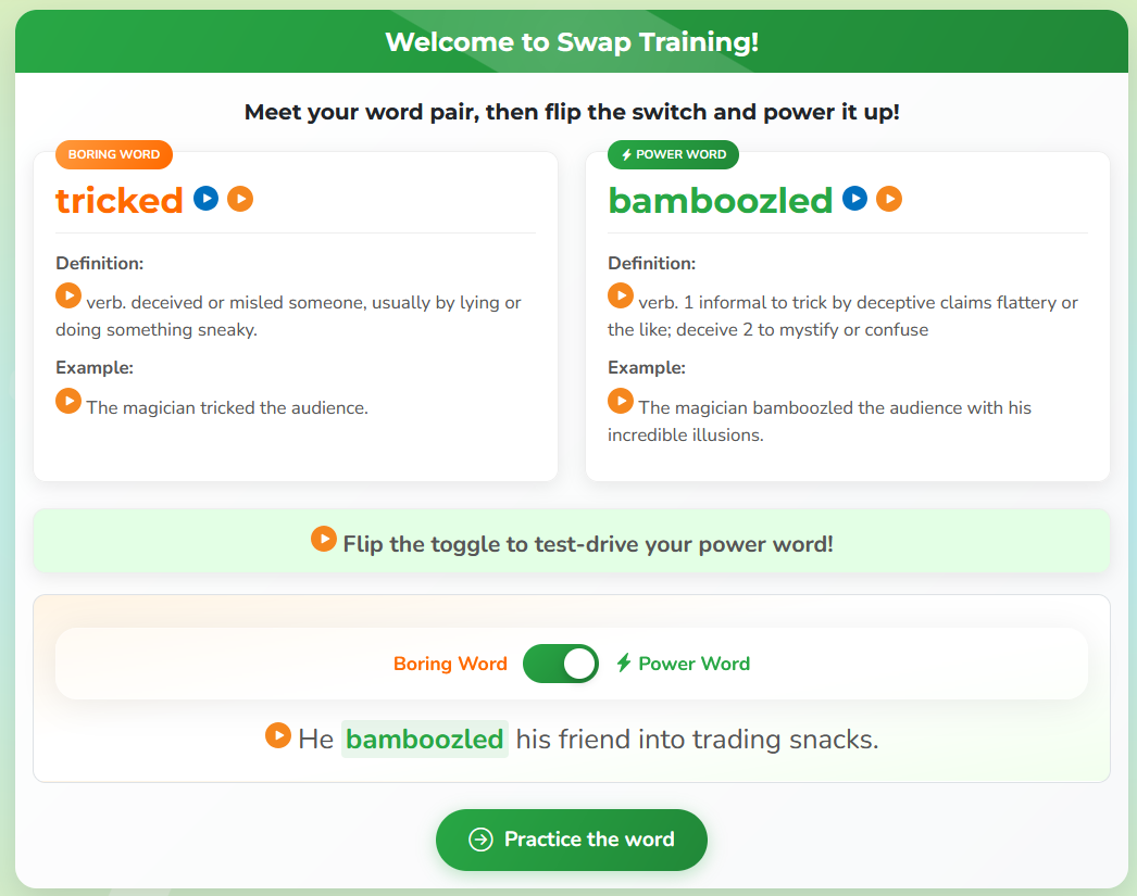By focusing on one word at a time and connecting it to student voice, real-world use, and multisensory input, Word Swapper helps learners go beyond memorization. They gain the courage to wield bold, precise language—and with that, something more powerful: confidence.
