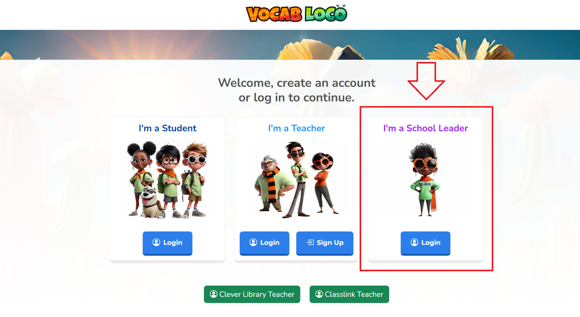 ➡️ https://vocabloco.com/loginClick on “I’m a School Leader”