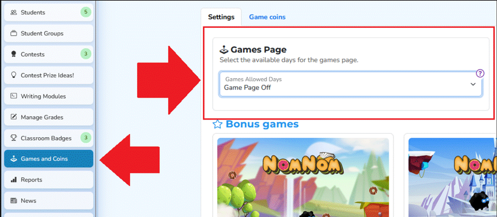 Where to find it: Teacher Account → Games & Coins (see image below)