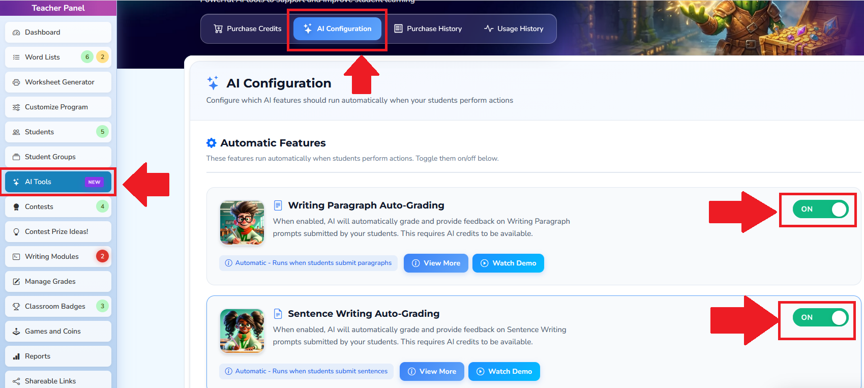 Vocab Loco allows teachers to control which AI features run automatically for students. Follow the steps below to turn on AI auto-grading for writing activities.